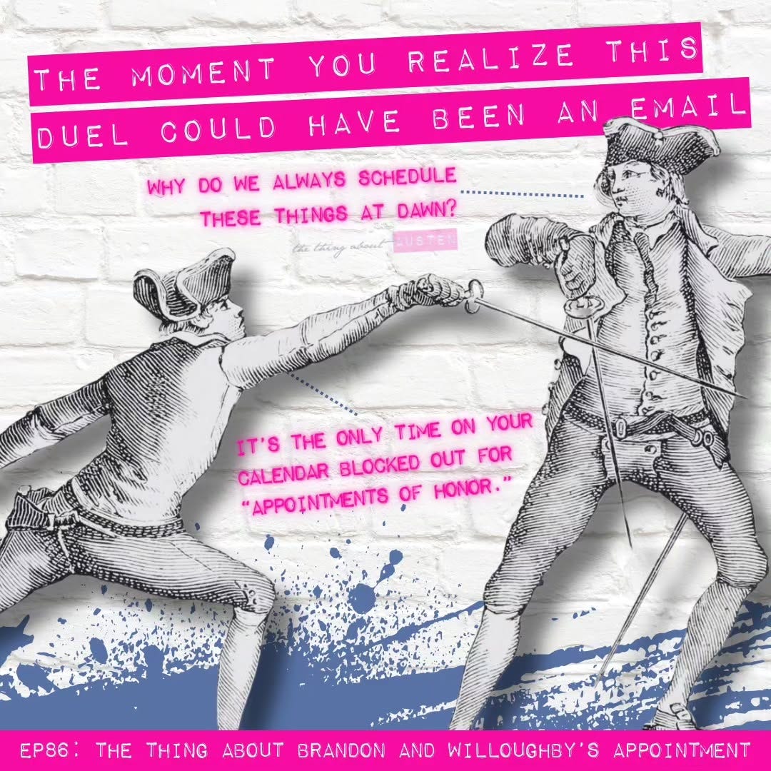 Colonel Brandon and Willoughby are about to meet by appointment, and their seconds are ready with all the necessary administrative details. Which leads us to ask the question, could this meeting have been an email? Join us this episode as we break down the details of the duel in Sense and Sensibility.