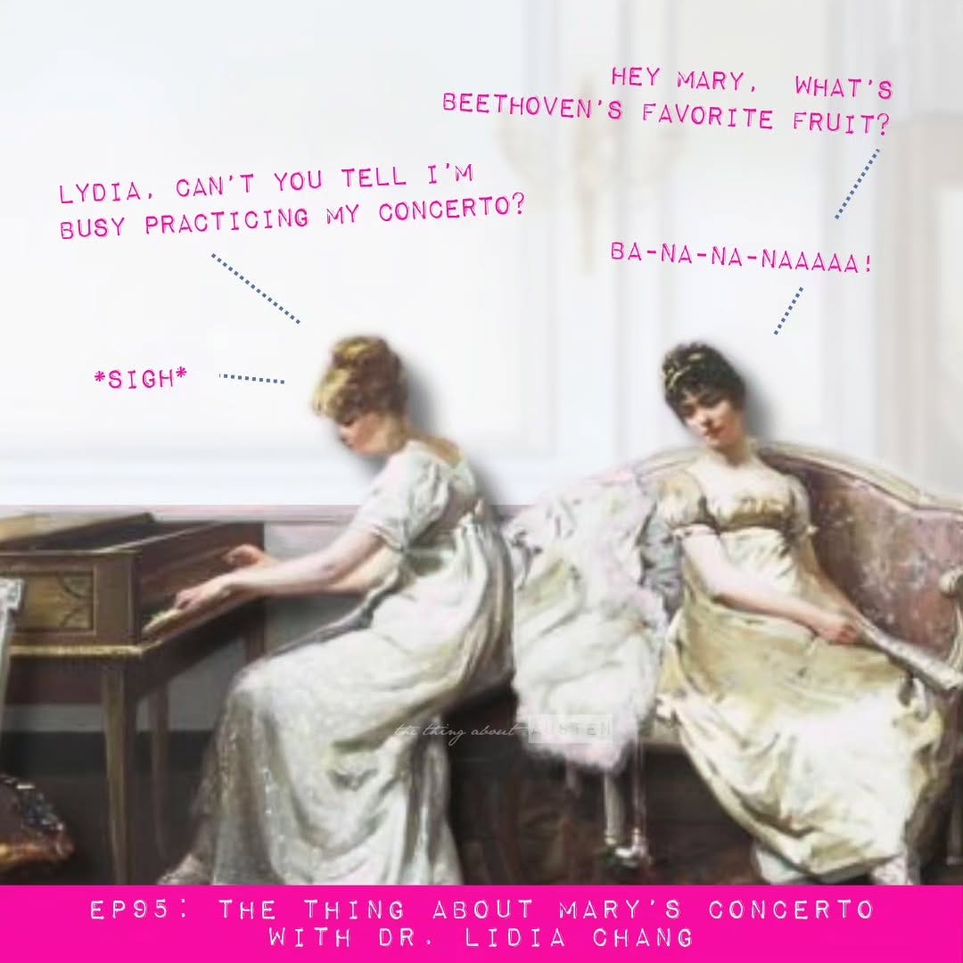 This episode we welcome back Dr. Lidia Chang to discuss Mary's performances within the context of Regency era societal expectations for a young lady's musical education and accomplishments.