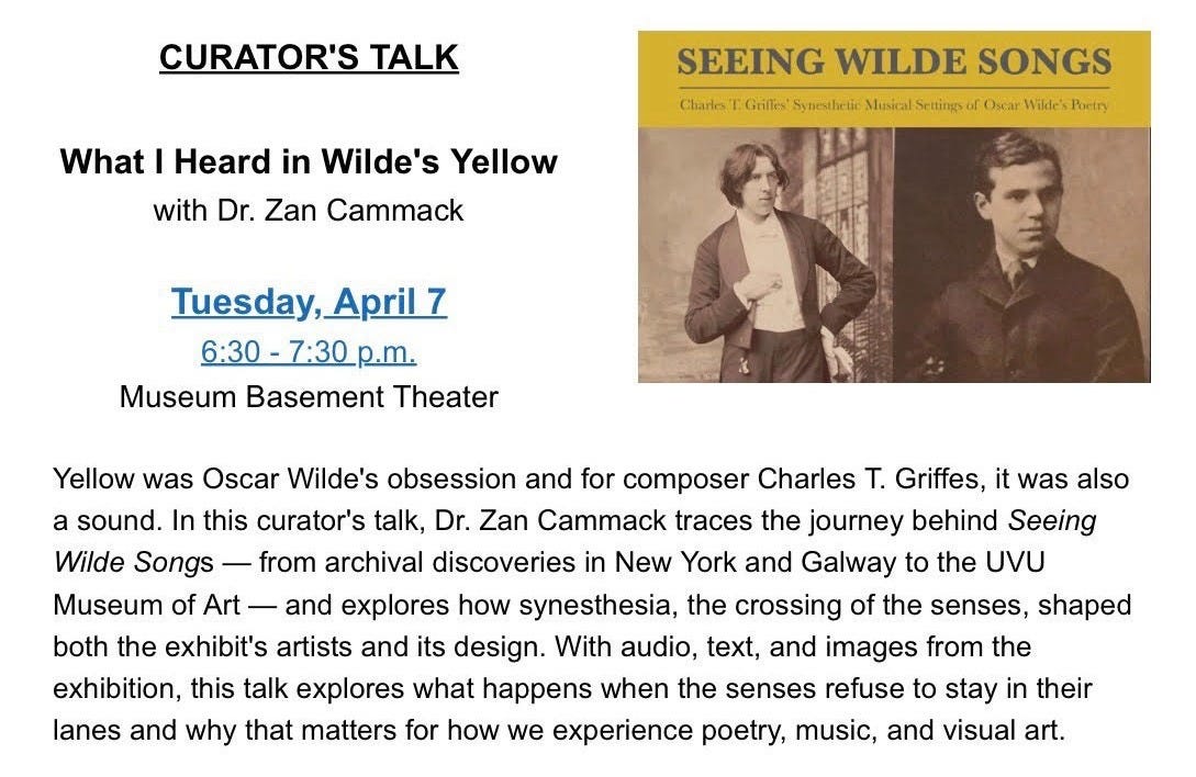 Zan curated an exhibit currently on display at the UVU Museum of Art titled “Seeing Wilde Songs: Charles T. Griffes’ Synesthetic Musical Settings of Oscar Wilde’s Poetry.” For any of you in the greater Salt Lake area, the exhibit runs through May 23, 2026. Learn more here.
